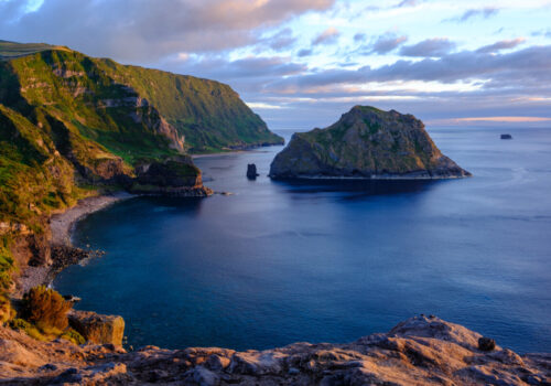 Our day kicks off with a sunrise at the scenic Baía da Alagoa, a rocky bay offering a mesmerizing view of rugged basalt sea stacks as our main subject, with Corvo Island in the background.